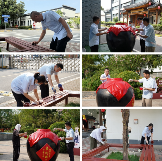 刷漆活动中,大家不惧高温、不畏酷暑,对厂区内景观凳、景观酒坛等进行打磨刷漆、翻新维护,想在前、做在前、干在前,深刻践行公司“三个人人”行为理念。