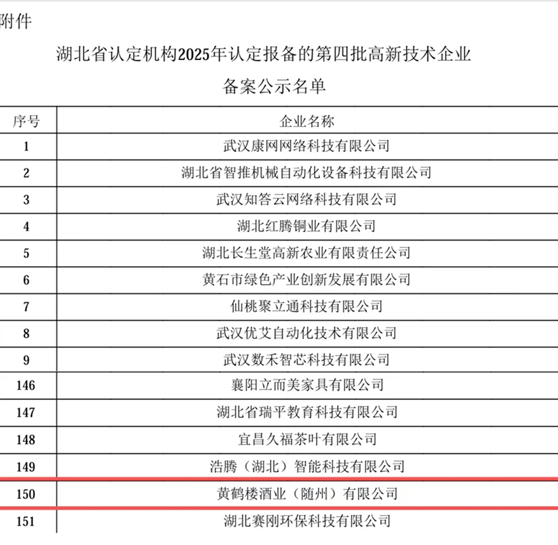 近日,湖北省认定机构发布《关于对2025年认定报备的第四批高新技术企业进行备案的公示》,鸿运国际酒业(随州)有限公司成功入选第四批高新技术企业备案公示名单。